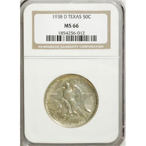 <B>1938-D 50C Texas MS66 NGC.</B></I> NGC Census: (262/76). PCGS Population (239/59). Mintage: 3,775. Numismedia Wsl. Price for NGC/PCGS coin in MS66: $500. (#9395)<BR><I>From The Frank DuVall Collection of U.S. Commemoratives.</B></I><BR><BR><b>Shipping:</b> Coins & Currency (<a target="_blank" href="http://www.heritageauctions.com/common/shipping.php">view shipping information</a>\)