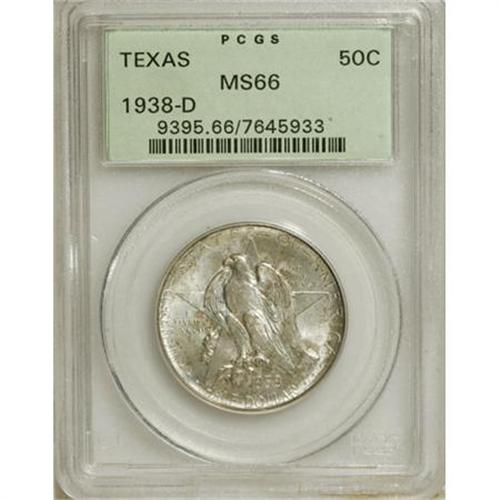 <B>1938-D 50C Texas MS66 PCGS.</B></I> PCGS Population (246/60). NGC Census: (266/81). Mintage: 3,775. Numismedia Wsl. Price for NGC/PCGS coin in MS66: $525. (#9395)<BR><BR><b>Shipping:</b> Coins & Currency (<a target="_blank" href="http://www.heritageauctions.com/common/shipping.php">view shipping information</a>)