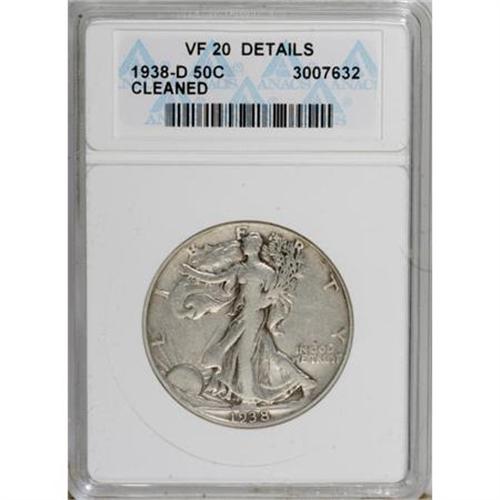 <B>1938-D 50C --Cleaned--ANACS. VF20 Details.</B></I> NGC Census: (13/1121). PCGS Population (35/2291). Mintage: 491,600. Numismedia Wsl. Price for NGC/PCGS coin in VF20: $108. (#6605)<BR><BR><B>Coin Engraver:</B> Adolph A. Weinman<BR><BR><b>Shipping:</b> Coins & Currency (<a target="_blank" href="http://www.heritageauctions.com/common/shipping.php">view shipping information</a>)