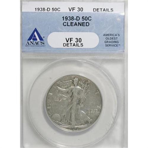 <B>1938-D 50C --Cleaned--ANACS. VF30 Details.</B></I> NGC Census: (15/1117). PCGS Population (43/2308). Mintage: 491,600. Numismedia Wsl. Price for NGC/PCGS coin in VF30: $126. (#6605)<BR><BR><B>Coin Engraver:</B> Adolph A. Weinman<BR><BR><b>Shipping:</b> Coins & Currency (<a target="_blank" href="http://www.heritageauctions.com/common/shipping.php">view shipping information</a>)