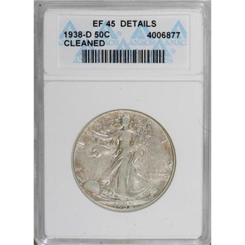 <B>1938-D 50C --Cleaned--ANACS. XF45 Details.</B></I> NGC Census: (46/996). PCGS Population (48/2143). Mintage: 491,600. Numismedia Wsl. Price for NGC/PCGS coin in XF45: $162. (#6605)<BR><BR><B>Coin Engraver:</B> Adolph A. Weinman<BR><BR><b>Shipping:</b> Coins & Currency (<a target="_blank" href="http://www.heritageauctions.com/common/shipping.php">view shipping information</a>)