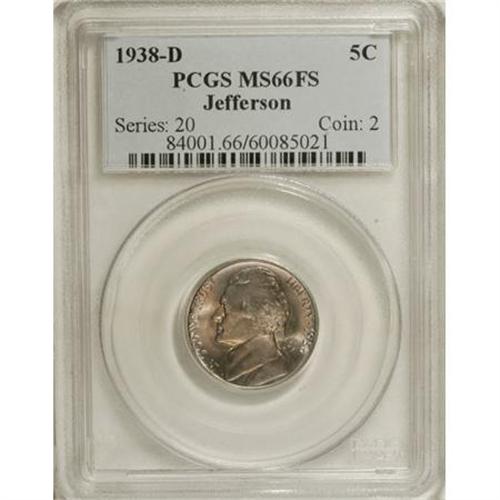 <B>1938-D 5C MS66 Full Steps PCGS.</B></I> PCGS Population (160/28). NGC Census: (7/3). (#84001)<BR><BR><b>Shipping:</b> Coins & Currency (<a target="_blank" href="http://www.heritageauctions.com/common/shipping.php">view shipping information</a>)