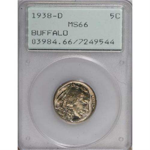 <B>1938-D 5C MS66 PCGS.</B></I> PCGS Population (21964/1225). NGC Census: (16669/1507). Mintage: 7,020,000. Numismedia Wsl. Price for NGC/PCGS coin in MS66: $84. (#3984)<BR><BR><B>Coin Engraver:</B> James E. Fraser<BR><BR><b>Shipping:</b> Coins & Currency (<a target="_blank" href="http://www.heritageauctions.com/common/shipping.php">view shipping information</a>)