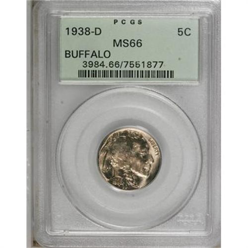 <B>1938-D 5C MS66 PCGS.</B></I> PCGS Population (22072/1230). NGC Census: (16768/1529). Mintage: 7,020,000. Numismedia Wsl. Price for NGC/PCGS coin in MS66: $84. (#3984)<BR><BR><B>Coin Engraver:</B> James E. Fraser<BR><BR><b>Shipping:</b> Coins & Currency (<a target="_blank" href="http://www.heritageauctions.com/common/shipping.php">view shipping information</a>)