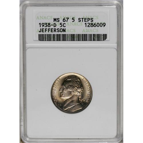 <B>1938-D<5C> MS67 5 Steps ANACS.</B></I> Peach and lavender toning graces this lustrous and remarkably smooth Superb Gem. From a low mintage issue, although numerous rolls were set aside because of the transition of types.