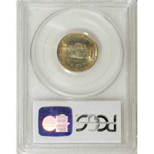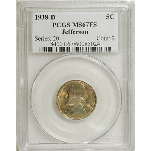<B>1938-D 5C MS67 Full Steps PCGS.</B></I> Fully struck with a few light marks and splendid rainbow toning over each side. One of the most attractive '38-D Jeffersons that we have seen. Population: 28 in 67 Full Steps, 0 finer (3/07).<BR><BR><b>Shipping:</b> Coins & Currency (<a target="_blank" href="http://www.heritageauctions.com/common/shipping.php">view shipping information</a>)