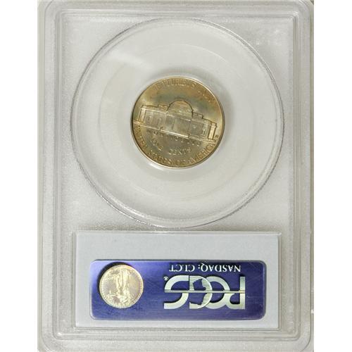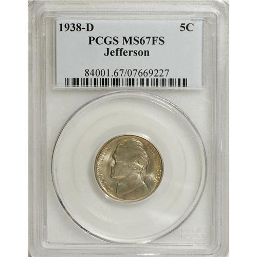 <B>1938-D 5C MS67 Full Steps PCGS.</B></I> It is the gorgeous peripheral toning on each side of this first-year Superb Gem that immediately captures the eye of the viewer. Well struck and impressively preserved; the reverse is pristine while the obverse shows just a couple of tiny marks on Jefferson's cheekbone. Population: 28 in 67 Full Steps, 0 finer (3/07).<BR><BR><b>Shipping:</b> Coins & Currency (<a target="_blank" href="http://www.heritageauctions.com/common/shipping.php">view shipping information</a>)