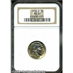 <B>1938-D<5C> MS67 NGC.</B></I> Light-gold and pale-violet coloration covers lustrous surfaces that appear to be free of significant blemishes. <BR><BR><B>Important notice:</B> Heritage usually auctions material at the rate of 200-250 lots per hour. On some occasions eBay Live bid software or the Internet may not be able to keep up with the pace of the auction. We recommend placing a realistic absentee bid now as insurance to avoid disappointment. Occasionally the auctioneer may eliminate or reject an eBay Live bid, and the auctioneer may also reopen a lot after the close of the eBay live bidding (usually because we missed an audience bid), and may reject your bid even if it shows you as the winning bidder. By bidding via eBay Live, you agree that Heritage may award the lot to another bidder at its sole discretion under the circumstances described above or any other reasonable circumstances. Since eBay bids are not shown to us until we open the lot on the floor, we treat those bids just like floor bids. In most cases the floor responds before the eBay bid is presented to us, due to Internet lag time, so for consistency we have made it a policy that floor bids are always considered first over tie eBay live bids. Also please note that all Heritage lots purchased through eBay Live carry a 20% Buyer's Premium. Please make sure you read the Terms and Conditions before you bid. </span></font></tr></table></td></tr></table>