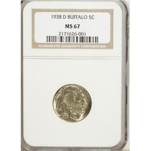<B>1938-D 5C MS67 NGC.</B></I> NGC Census: (1511/13). PCGS Population (1222/8). Mintage: 7,020,000. Numismedia Wsl. Price for NGC/PCGS coin in MS67: $284. (#3984)<BR><BR><B>Coin Engraver:</B> James E. Fraser<BR><BR><b>Shipping:</b> Coins & Currency (<a target="_blank" href="http://www.heritageauctions.com/common/shipping.php">view shipping information</a>)