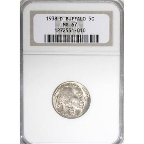 <B>1938-D 5C MS67 NGC.</B></I> NGC Census: (1516/13). PCGS Population (1223/8). Mintage: 7,020,000. Numismedia Wsl. Price for NGC/PCGS coin in MS67: $284. (#3984)<BR><BR><B>Coin Engraver:</B> James E. Fraser<BR><BR><b>Shipping:</b> Coins & Currency (<a target="_blank" href="http://www.heritageauctions.com/common/shipping.php">view shipping information</a>)