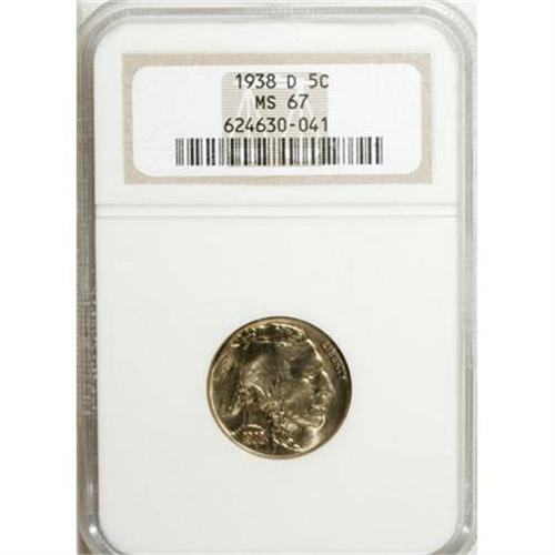 <B>1938-D 5C MS67 NGC.</B></I> NGC Census: (1517/13). PCGS Population (1227/8). Mintage: 7,020,000. Numismedia Wsl. Price for NGC/PCGS coin in MS67: $295. (#3984)<BR><BR><B>Coin Engraver:</B> James E. Fraser<BR><BR><b>Shipping:</b> Coins & Currency (<a target="_blank" href="http://www.heritageauctions.com/common/shipping.php">view shipping information</a>)