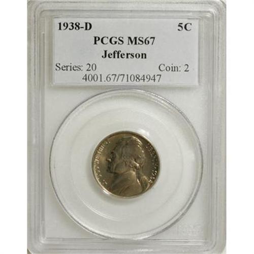 1938-D 5C MS67 PCGS. PCGS Population (191/2). NGC Cens