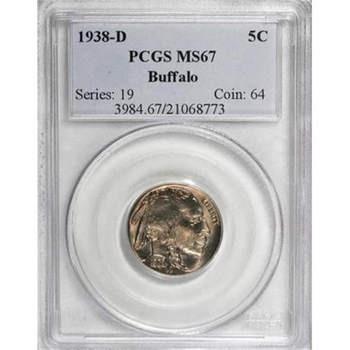 <B>1938-D 5C MS67 PCGS.</B></I> PCGS Population (1223/8). NGC Census: (1516/13). Mintage: 7,020,000. Numismedia Wsl. Price for NGC/PCGS coin in MS67: $284. (#3984)<BR><BR><B>Coin Engraver:</B> James E. Fraser<BR><BR><b>Shipping:</b> Coins & Currency (<a target="_blank" href="http://www.heritageauctions.com/common/shipping.php">view shipping information</a>)