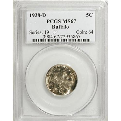 <B>1938-D 5C MS67 PCGS.</B></I> PCGS Population (1227/8). NGC Census: (1517/13). Mintage: 7,020,000. Numismedia Wsl. Price for NGC/PCGS coin in MS67: $295. (#3984)<BR><BR><B>Coin Engraver:</B> James E. Fraser<BR><BR><b>Shipping:</b> Coins & Currency (<a target="_blank" href="http://www.heritageauctions.com/common/shipping.php">view shipping information</a>)