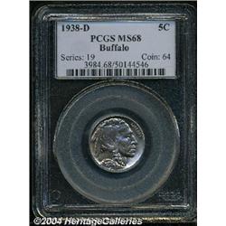 <B>1938-D<5C> MS68 PCGS.</B></I> An essentially perfect specimen with no visible flaws or detractions visible to the naked eye. The strike is bold and sharp as is normally seen on this final year issue. Mostly brilliant with a silver-gray finish, some subtle hints of rose color decorate the left side of the obverse and most of the reverse. Presently unsurpassable in grade. Population: 5 in 68, none finer at either service (9/04). <BR><BR><B>Important notice:</B> Heritage usually auctions material at the rate of 200-250 lots per hour. On some occasions eBay Live bid software or the Internet may not be able to keep up with the pace of the auction. We recommend placing a realistic absentee bid now as insurance to avoid disappointment. Occasionally the auctioneer may eliminate or reject an eBay Live bid, and the auctioneer may also reopen a lot after the close of the eBay live bidding (usually because we missed an audience bid), and may reject your bid even if it shows you as the winning bidder. By bidding via eBay Live, you agree that Heritage may award the lot to another bidder at its sole discretion under the circumstances described above or any other reasonable circumstances. Since eBay bids are not shown to us until we open the lot on the floor, we treat those bids just like floor bids. In most cases the floor responds before the eBay bid is presented to us, due to Internet lag time, so for consistency we have made it a policy that floor bids are always considered first over tie eBay live bids. Also please note that all Heritage lots purchased through eBay Live carry a 20% Buyer's Premium. Please make sure you read the Terms and Conditions before you bid.