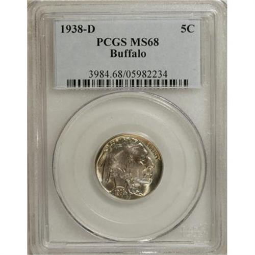 <B>1938-D 5C MS68 PCGS.</B></I> In 1938 when the mandatory 25-year period for new coinage issues had expired, Treasury and Mint officials were eager to move to a new design, since the Buffalo nickel was impossibly difficult to strike up properly, and the series was plagued by die breaks. The mintage in 1938 was confined to the Denver Mint, and a rumor spread that those pieces were going to be valuable. Accordingly, collectors saved thousands of rolls of the issue. Fortunately for collectors, the issue was well produced, leading to the occasional availability of splendid, near-perfect examples such as the present piece. <BR> Pale lilac color that predominates on both sides complements the lavish golden-orange hues that encircle the periphery, with deep rose near the devices. The strike is unfailingly sharp throughout, and only the most trivial signs of contact appear under a loupe. A lovely coin for aficionados of original toning. Population: 7 in 68, 0 finer (7/07).<BR><BR><B>Coin Engraver:</B> James E. Fraser<BR><BR><b>Shipping:</b> Coins & Currency (<a target="_blank" href="http://www.heritageauctions.com/common/shipping.php">view shipping information</a>\)