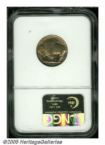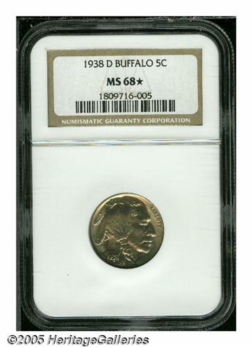 <B>1938-D<5C> MS68 <S NGC.</B></I> The first Buffalo Nickels were coined in 1913, and for 26 years it was a popular and well-liked design. This coin, struck in the 26th year of production, represents the final issue of the design. The new Jefferson Head nickel design by Felix Schlag made its debut and was on the way to a long production run that is still current today. The '38-D Buffalo that we are offering here is highly attractive with frosty luster and a delightful blend of pale rose, gold, and mint-green toning. The design features are sharp, with a full braid on the obverse and full details on the reverse with no surface distractions. The NGC Census records 10 examples in MS68 with four of those that have received the coveted MS68 <S designation.