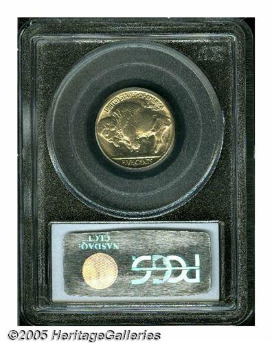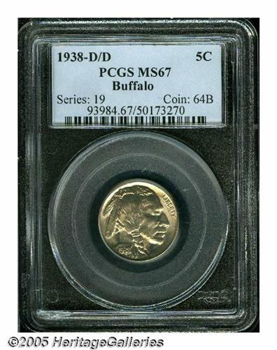 <B>1938-D/D<5C> Buffalo MS67 PCGS.</B></I> A supremely lustrous example with obvious repunching of the mintmark visible under light magnification. Both sides are overlaid in delicate golden patina. Population: 45 in 67, 0 finer (3/05).