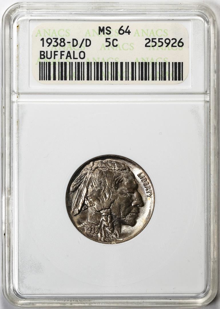 One 1938-D/D Buffalo Nickel Coin ANACS MS64 Old Soapbox Holder. ANACS Certified.