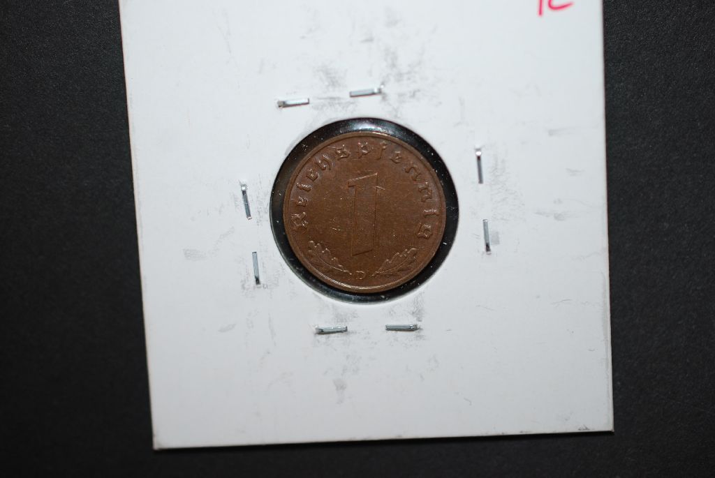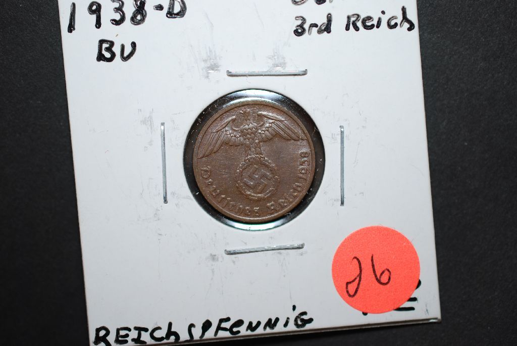 1938-D German 2 Reichspfennig Foreign Coin With Flying Eagle Holding Swatstika; BU; EST. $10-15
