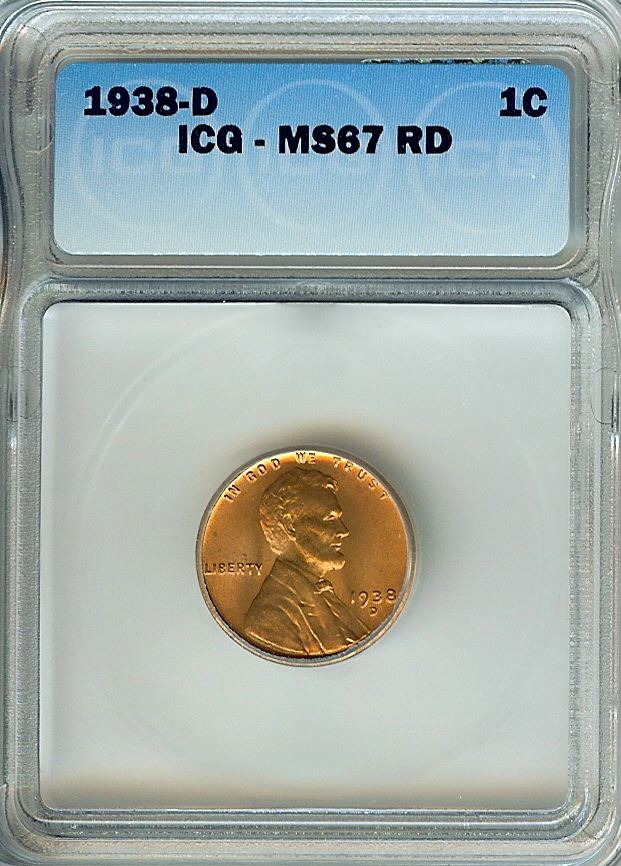 1938-D LINCOLN WHEAT CENT ICG MS-67 RED SCARCE THIS NICE!