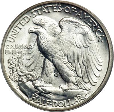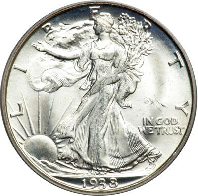 1938-D Liberty Walking Half Dollar. PCGS graded MS-65. A lovely gem Walker. 491,600 minted of which only 30,000 are estimated to have survived according to experts who have studied this very attractive series of half dollar coins struck in the first half of the last century. 1938-D has long been a favorite with collectors. There is a remarkable photograph still in existence that shows the entire coinage of 1938-D half dollars in Mint-sealed canvas bags on a wheeled dolly at the Denver Mint before being distributed to banks that year! (PCGS # 6605) .