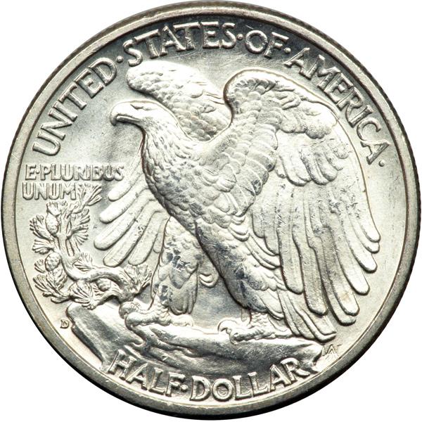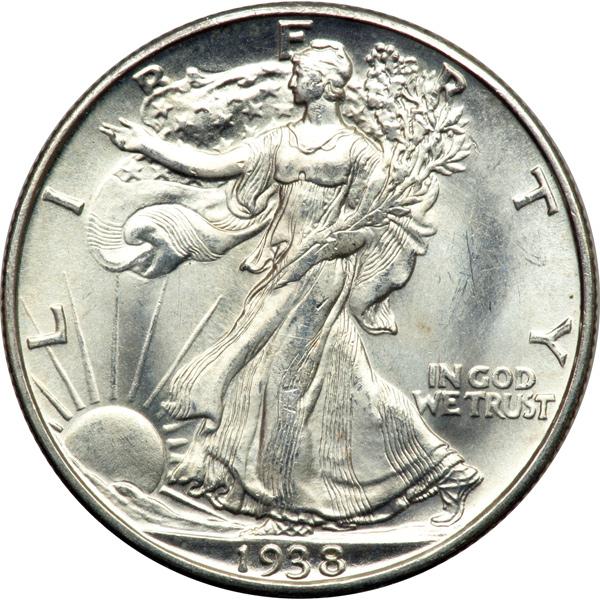 1938-D Liberty Walking Half Dollar. PCGS graded MS-65. Well struck and mostly untoned, this is the key date in the later 1930s, and one of the lowest mintage in the entire Walking Liberty half dollar series. The stark white satin-like luster is almost unimpaired by abrasions of any size (PCGS # 6605) .