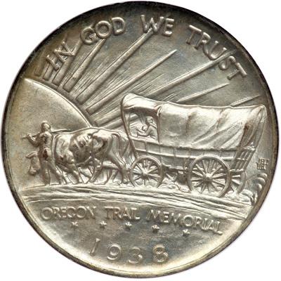1938-D Oregon Trail Half Dollar. NGC graded MS-67. Aa superb gem with delicate light pastel toning. This conditionally scarce contribution to the sale is satiny with lovely surfaces. The strike is free of censure, being sharp in all areas. Only 6005 struck (PCGS # 9349) .