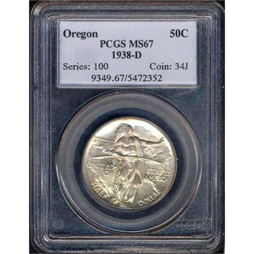 <b>1938-D Oregon Trail Half Dollar. PCGS graded MS67.</b> Swirling luster on a bright satin finish. Most coins of this date are superbly struck; some are little better as seen in the low mintage 1938-D; and collectors, true to their tradition, wish that all could be like this beautiful example exhibiting fine detail to all the high points, with superb surface luster <b>(PCGS # 9349)</b>