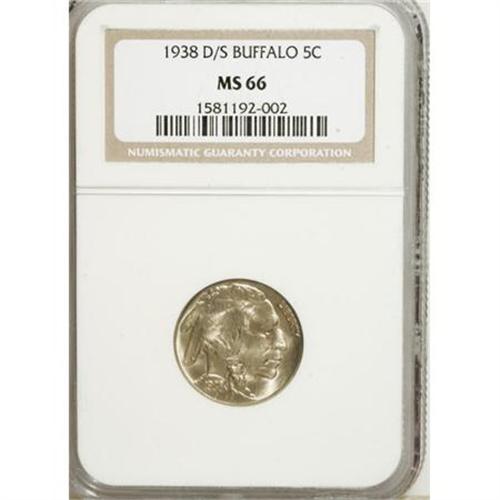 <B>1938-D/S 5C MS66 NGC.</B></I> NGC Census: (686/61). PCGS Population (1248/147). Mintage: 7,020,000. Numismedia Wsl. Price for NGC/PCGS coin in MS66: $223. (#3985)<BR><BR><B>Coin Engraver:</B> James E. Fraser<BR><BR><b>Shipping:</b> Coins & Currency (<a target="_blank" href="http://www.heritageauctions.com/common/shipping.php">view shipping information</a>)