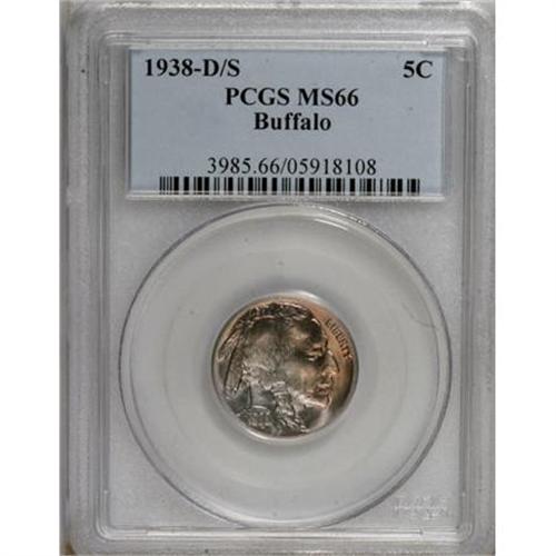 <B>1938-D/S 5C MS66 PCGS.</B></I> PCGS Population (1209/146). NGC Census: (682/63). Mintage: 7,020,000. Numismedia Wsl. Price for NGC/PCGS coin in MS66: $223. (#3985)<BR><BR><B>Coin Engraver:</B> James E. Fraser<BR><BR><b>Shipping:</b> Coins & Currency (<a target="_blank" href="http://www.heritageauctions.com/common/shipping.php">view shipping information</a>)