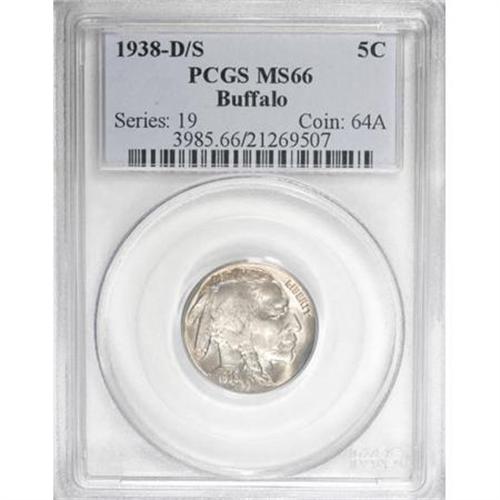 <B>1938-D/S 5C MS66 PCGS.</B></I> PCGS Population (1252/147). NGC Census: (686/61). Mintage: 7,020,000. Numismedia Wsl. Price for NGC/PCGS coin in MS66: $223. (#3985)<BR><BR><B>Coin Engraver:</B> James E. Fraser<BR><BR><b>Shipping:</b> Coins & Currency (<a target="_blank" href="http://www.heritageauctions.com/common/shipping.php">view shipping information</a>)