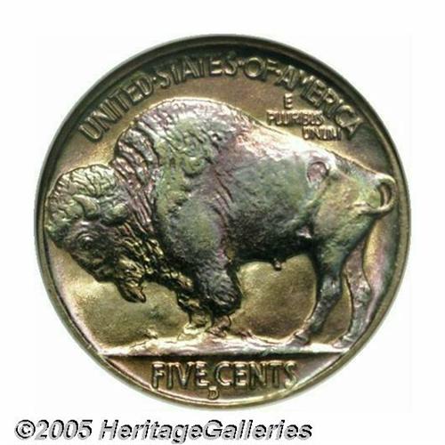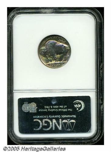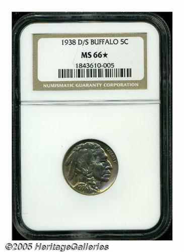 <B>1938-D/S<5C> MS66 <S NGC.</B></I> FS-020.5. OMM-1. Vivid ruby, lime, powder-blue, and gold colors dominate this crisply struck and carefully preserved premium Gem. The most desirable variety of the final year 1938-D Buffalo Nickel, the S undermintmark is obvious above and within the Denver mintmark, which is also repunched south. As of (4/05), NGC has awarded a star to only three examples of the 1938-D/S, one each in the MS66, MS67, and MS68 grades.