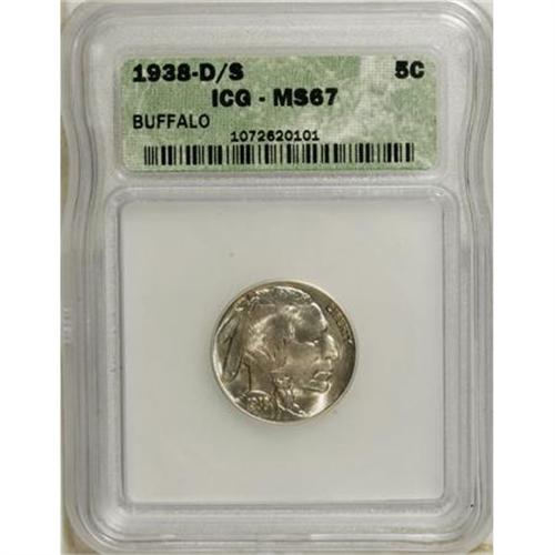 <B>1938-D/S 5C MS67 ICG.</B></I> NGC Census: (70/3). PCGS Population (147/0). Mintage: 7,020,000. Numismedia Wsl. Price for NGC/PCGS coin in MS67: $2,200. (#3985)<BR><BR><B>Coin Engraver:</B> James E. Fraser<BR><BR><b>Shipping:</b> Coins & Currency (<a target="_blank" href="http://www.heritageauctions.com/common/shipping.php">view shipping information</a>)