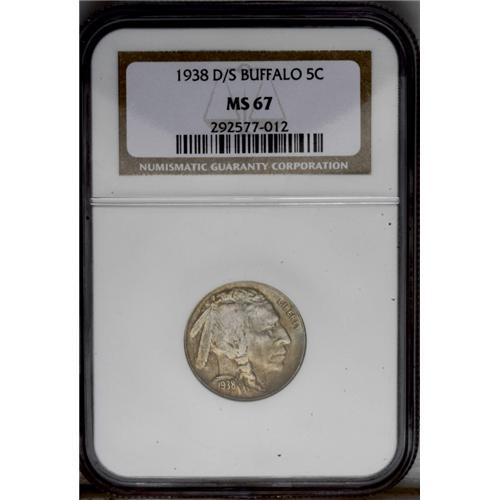 <B>1938-D/S<5C> MS67 NGC.</B></I> The undermintmark S emerges within and above the prominent D mintmark. Delightful olive-brown and lilac-blue toning adorns this lustrous and crisp Superb Gem. Census: 30 in 67, 1 finer (3/06).<BR><I>From The Alex & Nan Registry Sets.</B></I> <BR><BR><B>Important notice:</B> Heritage usually auctions material at the rate of 200-250 lots per hour. On some occasions eBay Live bid software or the Internet may not be able to keep up with the pace of the auction. We recommend placing a realistic absentee bid now as insurance to avoid disappointment. Occasionally the auctioneer may eliminate or reject an eBay Live bid, and the auctioneer may also reopen a lot after the close of the eBay live bidding (usually because we missed an audience bid), and may reject your bid even if it shows you as the winning bidder. By bidding via eBay Live, you agree that Heritage may award the lot to another bidder at its sole discretion under the circumstances described above or any other reasonable circumstances. Since eBay bids are not shown to us until we open the lot on the floor, we treat those bids just like floor bids. In most cases the floor responds before the eBay bid is presented to us, due to Internet lag time, so for consistency we have made it a policy that floor bids are always considered first over tie eBay live bids. Also please note that all Heritage lots purchased through eBay Live carry a 20% Buyer's Premium. Please make sure you read the Terms and Conditions before you bid. This lot is being auctioned in conjunction with a live floor auction by Heritage Galleries & Auctioneers. All final auction and invoice information will be supplied by Heritage Galleries & Auctioneers, and all other information should be considered preliminary. Lot:1146 <BR><BR><B>Winning Notification and Billing:</B> After the FINAL session in this auction is complete, Heritage will send e-mail and snail mail invoices. This process normally takes several days. All final auction and invoice information will be supplied by Heritage Galleries & Auctioneers, and all other information should be considered preliminary. <BR><BR>This auction will be conducted on a live auction floor and over the Internet through eBay Live. If you choose to place an absentee bid, please take a moment to <font color='#0000ff'><u><a href='http://pages.ebay.com/liveauctions/help/before/laabsentee.html'>learn how eBay Live absentee bidding works</a></u></font><font color='#000000'>