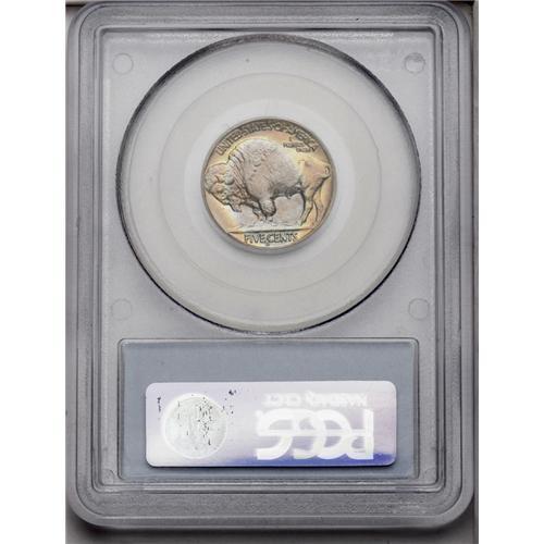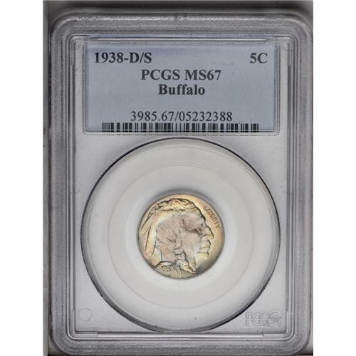 <B>1938-D/S<5C> MS67 PCGS.</B></I> Despite its pristine Superb Gem surfaces, this example's most memorable quality is its gorgeous, original toning. Variegated hues of gold, rose, green, and steel-blue create a rainbow effect over both the obverse and the reverse. As befits the assigned grade, both the strike and surface preservation are free of criticism. Remnants of the undermintmark are easily visible under suitable magnification.