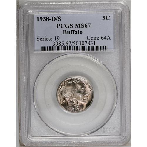 <B>1938-D/S 5C MS67 PCGS.</B></I> FS-020.5. OMM-1. Highly lustrous with hints of red-violet and gold patina on each side. The overmintmark is plain under magnification. Tied for the finest example of this variety certified by PCGS (10/06).<BR><BR><b>Shipping:</b> Coin/Currency (<a target="_blank" href="http://www.heritageauctions.com/common/shipping.php">view shipping information</a>)