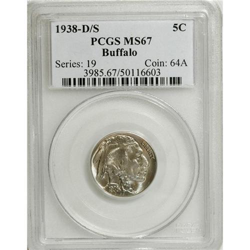 <B>1938-D/S 5C MS67 PCGS.</B></I> FS-020.5. OMM-1. The prominent overmintmark variety with the S visible above and within the D. Mauve and powder-blue endow this lustrous, sharply struck, and essentially pristine Superb Gem.<BR><BR><b>Shipping:</b> Coins & Currency (<a target="_blank" href="http://www.heritageauctions.com/common/shipping.php">view shipping information</a>)