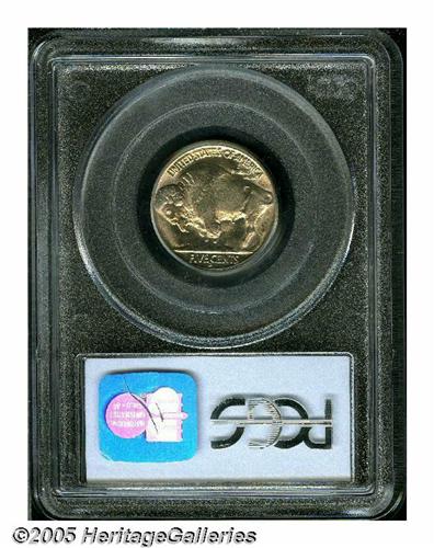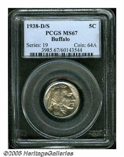 <B>1938-D/S<5C> MS67 PCGS.</B></I> OMM-1. Only the Denver Mint struck Buffalo Nickels in 1938, the design made obsolete by the arrival of the Jefferson Nickel. As a conservation measure, a few S-mint dies were overmintmarked and shipped to Denver for production. This example is light gold and pale violet, with lustrous, pristine surfaces. The design elements are generally well struck, with just a touch of softness on the hair above the braid.