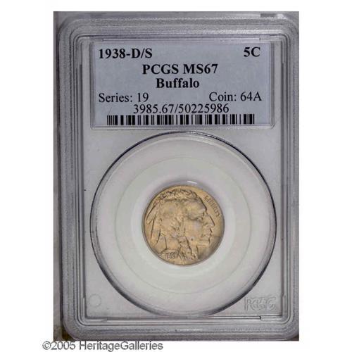 1938-D/S 5C MS67 PCGS. OMM-1. The S mintmark is seen a 1938-D/S[5C] MS67 PCGS.