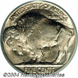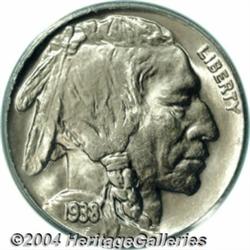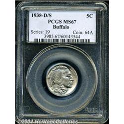 <B>1938-D/S<5C> MS67 PCGS.</B></I> Only the Denver Mint struck Buffalo Nickels in 1938, the design made obsolete by the arrival of the Jefferson Nickel. As a conservation measure (and perhaps to prevent a low mintage rarity) a few S-mint dies were overmintmarked and shipped to Denver for production. This example is light gold and pale violet, with lustrous, pristine surfaces. The design elements are generally well struck, with just a touch of softness on the Indian's hair. Population: 51 in 67, 0 finer (3/04). <BR><BR><B>Important notice:</B> Heritage usually auctions material at the rate of 200-250 lots per hour. On some occasions eBay Live bid software or the Internet may not be able to keep up with the pace of the auction. We recommend placing a realistic absentee bid now as insurance to avoid disappointment. Occasionally the auctioneer may eliminate or reject an eBay Live bid, and the auctioneer may also reopen a lot after the close of the eBay live bidding (usually because we missed an audience bid), and may reject your bid even if it shows you as the winning bidder. By bidding via eBay Live, you agree that Heritage may award the lot to another bidder at its sole discretion under the circumstances described above or any other reasonable circumstances. Since eBay bids are not shown to us until we open the lot on the floor, we treat those bids just like floor bids. In most cases the floor responds before the eBay bid is presented to us, due to Internet lag time, so for consistency we have made it a policy that floor bids are always considered first over tie eBay live bids. Also please note that all Heritage lots purchased through eBay Live carry a 20% Buyer's Premium. Please make sure you read the Terms and Conditions before you bid. </span></font></tr></table></td></tr></table>