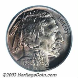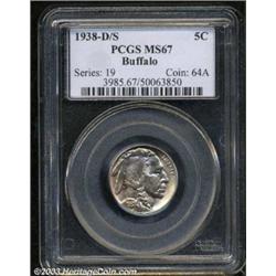 <TABLE cellSpacing=0 cellPadding=0 width="100%" bgColor=#000000 border=0><TBODY><TR><TD width="100%"><TABLE cellSpacing=1 cellPadding=3 width="100%" border=0><TBODY><TR><TD width="100%" bgColor=#79735c><FONT face=arial color=#ffffff size=3><B>Description</B> </FONT></TD></TR><TR><TD width="100%" bgColor=#ffffff><FONT face=arial size=2><B>1938-D/S 5C MS67 PCGS.</B></I> A lustrous Gem with blushes of lilac and golden-amber color over essentially undisturbed surfaces. The D over S has long been a favorite of Buffalo Nickel enthusiasts. Population: 23 in 67, 0 finer (8/03). </FONT></TD></TR></TBODY></TABLE></TD></TR></TBODY></TABLE><BR><A name=PricesRealized></A><TABLE cellSpacing=0 cellPadding=0 width="100%" bgColor=#000000 border=0><TBODY><TR><TD width="100%"><TABLE cellSpacing=1 cellPadding=3 width="100%" border=0><TBODY><TR><TD width="100%" bgColor=#79735c><A name=PR><FONT face=arial color=#ffffff size=3><B>Previous Prices from Heritage Auctions</B> </FONT></A></TD></TR><TR><TD bgColor=#f6f6ed><TABLE cellSpacing=0 cellPadding=0 width="100%" border=1><TBODY><TR><TD align=middle width="33%"><B>Date</B></TD><TD align=middle width="33%"><B>Service</B></TD><TD align=middle width="33%"><B>Price</B></TD></TR><TR bgColor=whitesmoke><TD width="33%"><B>06/08/2002</B></TD><TD width="33%">PCGS</TD><TD width="33%">$2,357.50</TD></TR><TR bgColor=whitesmoke><TD width="33%"><B>08/02/1997</B></TD><TD width="33%">PCGS</TD><TD width="33%">$2,127.50</TD></TR><TR bgColor=whitesmoke><TD width="33%"><B>08/19/1995</B></TD><TD width="33%">PCGS</TD><TD width="33%">$3,190.00</TD></TR><TR bgColor=whitesmoke><TD width="33%"><B>01/05/2001</B></TD><TD width="33%">NGC</TD><TD width="33%">$862.50</TD></TR><TR bgColor=whitesmoke><TD width="33%"><B>06/01/2000</B></TD><TD width="33%">PCGS</TD><TD width="33%">$1,553.00</TD></TR><TR bgColor=whitesmoke><TD width="33%"><B>04/05/2001</B></TD><TD width="33%">PCGS</TD><TD width="33%">$1,897.50</TD></TR><TR bgColor=whitesmoke><TD width="33%"><B>09/01/1999</B></TD><TD width="33%">NGC</TD><TD width="33%">$1,323.00</TD></TR><TR bgColor=whitesmoke><TD width="33%"><B>03/01/2003</B></TD><TD width="33%">PCGS</TD><TD width="33%">$2,760.00</TD></TR><TR bgColor=whitesmoke><TD width="33%"><B>07/29/2003</B></TD><TD width="33%">PCGS</TD><TD width="33%">$2,875.00</TD></TR></TBODY></TABLE></TD></TR><TR><TD bgColor=#ffffff><FONT face=arial size=1 ?>PLEASE NOTE: All prices realized reflect the final hammer price PLUS the buyer's premium in auctions that charge a buyer's premium. Each item has a notation at the top of the listing indicating whether that lot included a buyer's premium. Example: A item that sells with a final hammer price of $100 and a 20% buyer's premium will display with a price realized of $120. All information listed is intended to be as accurate as possible, but errors are possible. Please use this guide carefully and inform us of any inaccuracies. </FONT></TD></TR></TBODY></TABLE></TD></TR></TBODY></TABLE><BR><TABLE cellSpacing=0 cellPadding=0 width="100%" bgColor=#000000 border=0><TBODY><TR><TD width="100%"><TABLE cellSpacing=1 cellPadding=3 width="100%" border=0><TBODY><TR><TD width="100%" bgColor=#79735c colSpan=6><FONT face=arial color=#ffffff size=3><B>Price Guide*</B> </FONT></TD></TR><TR bgColor=#f6f6ed><TD align=middle><B>Grade</B> </TD><TD align=middle><B>Coin World<BR>(Trends)</B> </TD><TD align=middle><B>Numismedia<BR>Retail</B> </TD><TD align=middle><B>Numismedia<BR>Wholesale</B> </TD><TD align=middle><B>Coin<BR>Universe</B> </TD><TD align=middle><B>Heritage<BR>Value Index</B> </TD></TR><TR bgColor=#ffffff><TD align=middle>66</TD><TD align=right>$400.00</TD><TD align=right>$265.00</TD><TD align=right>$212.00</TD><TD align=right>$300.00</TD><TD align=right>$241.67</TD></TR><TR style="FONT-WEIGHT: bold" bgColor=#cccfdd><TD align=middle>67</TD><TD align=right>---</TD><TD align=right>---</TD><TD align=right>$2,125.00</TD><TD align=right>$3,850.00</TD><TD align=right>$1,635.58</TD></TR><TR bgColor=#ffffff><TD align=middle>68</TD><TD align=right>---</TD><TD align=right>---</TD><TD align=right>---</TD><TD align=right>---</TD><TD align=right>---</TD></TR><TR bgColor=#ffffff><TD colSpan=6><FONT size=1>*All information listed is intended to be as accurate as possible, but errors are possible. No item may be returned or refused based on this information which is provided as a service to our customers. You should contact each pricing source directly to determine the accuracy of this information. </FONT></TD></TR></TBODY></TABLE></TD></TR></TBODY></TABLE><BR><TABLE cellSpacing=0 cellPadding=0 width="100%" bgColor=#000000 border=0><TBODY><TR><TD width="100%"><TABLE cellSpacing=1 cellPadding=3 width="100%" border=0><TBODY><TR><TD width="100%" bgColor=#79735c><FONT face=arial color=#ffffff size=3><B>Population Guide</B> </FONT></TD></TR><TR bgColor=#ffffff><TD align=middle><!-- Begin Output of Population Grid--><TABLE cellSpacing=0 cellPadding=0 width="100%" border=0><TBODY><TR><TD vAlign=center><TABLE cellSpacing=0 width="100%" border=1 cellsadding="3"><TBODY><TR><TD vAlign=center><TABLE cellSpacing=0 cellPadding=3 width="100%" border=1><TBODY><TR><TD vAlign=center align=middle bgColor=#f0f1e8 colSpan=2 <CENTER><FONT face=Arial size=2><B>PCGS Pop </B></FONT><CENTER></CENTER></TD><TD vAlign=center align=middle bgColor=#f0f1e8 colSpan=2><CENTER><FONT face=Arial size=2><B>NGC Pop</B></CENTER></FONT></TD></TR><TR><TD vAlign=center><FONT face=Arial size=2>(67)</FONT> </TD><TD vAlign=center align=right><FONT face=Arial size=2>23</FONT> </TD><TD vAlign=center><FONT face=Arial size=2>(67)</FONT> </TD><TD vAlign=center align=right><FONT face=Arial size=2>18</FONT> </TD></TR><TR><TD vAlign=center><FONT face=Arial size=2>(>67)</FONT> </TD><TD vAlign=center align=right><FONT face=Arial size=2>0</FONT> </TD><TD vAlign=center><FONT face=Arial size=2>(>67)</FONT> </TD><TD vAlign=center align=right><FONT face=Arial size=2>1</FONT> </TD></TR></TBODY></TABLE></TD></TR></TBODY></TABLE></TD></TR></TB