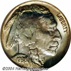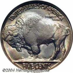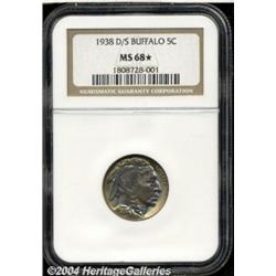<B>1938-D/S<5C> MS68 <S NGC.</B></I> FS-020.5. OMM-1. The curve of an S mintmark is unmistakable within the loop of the D mintmark. Rich rainbow-like colorations gracefully decorate the border areas as if this coin has been stored in a cardboard album for many years. Lustrous, nicely struck, and virtually unabraded as one would expect of the grade. This is the single finest certified example of this variety, PCGS has not certified any above MS67 and the other MS68 NGC example did not receive a star designation. <BR><BR><B>Important notice:</B> Heritage usually auctions material at the rate of 200-250 lots per hour. On some occasions eBay Live bid software or the Internet may not be able to keep up with the pace of the auction. We recommend placing a realistic absentee bid now as insurance to avoid disappointment. Occasionally the auctioneer may eliminate or reject an eBay Live bid, and the auctioneer may also reopen a lot after the close of the eBay live bidding (usually because we missed an audience bid), and may reject your bid even if it shows you as the winning bidder. By bidding via eBay Live, you agree that Heritage may award the lot to another bidder at its sole discretion under the circumstances described above or any other reasonable circumstances. Since eBay bids are not shown to us until we open the lot on the floor, we treat those bids just like floor bids. In most cases the floor responds before the eBay bid is presented to us, due to Internet lag time, so for consistency we have made it a policy that floor bids are always considered first over tie eBay live bids. Also please note that all Heritage lots purchased through eBay Live carry a 20% Buyer's Premium. Please make sure you read the Terms and Conditions before you bid. </span></font></tr></table></td></tr></table>