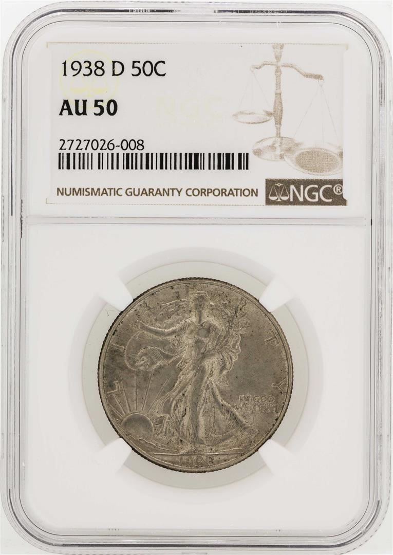 One 1938-D Walking Liberty Half Dollar Coin NGC AU50. NGC Certified.