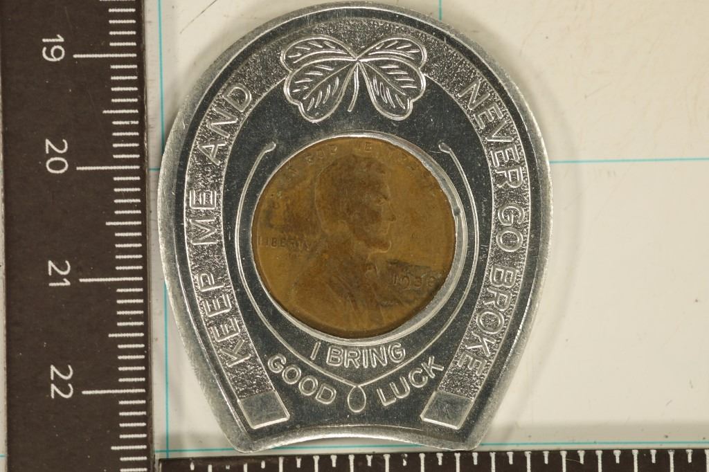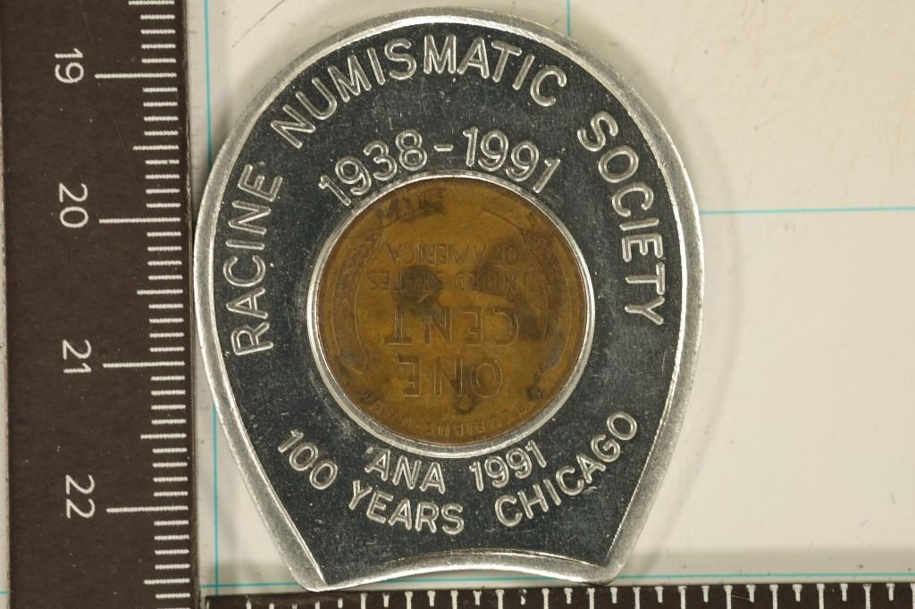 NEVER GO BROKE, I BRING GOOD LUCK" ON THE OBVERSE AND "1991 RACINE NUMISMATICS" ON THE REVERSE