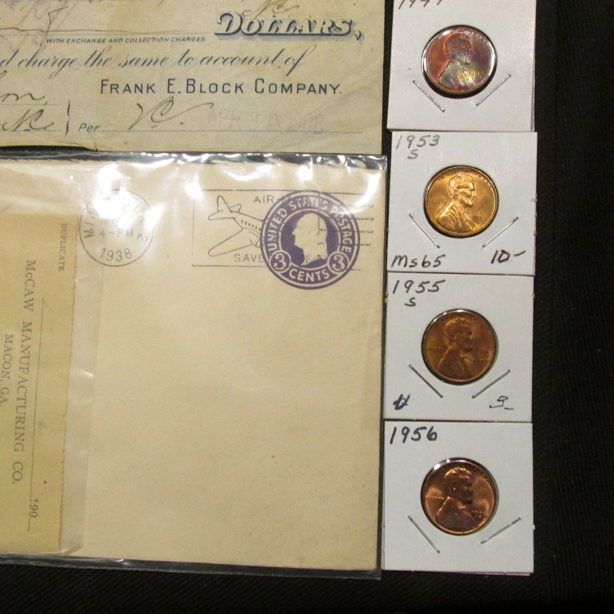 1938 Envelope & letter "F.E. Hunt Tax Agent…Miami, Florida"; 1921 Check "Twiggs County Bank…Jeffersonville, Ga."; 1906 area invoice McCaw Manufacturing Co. Macon, Ga."; 1908 Check Frank C. Block Co. Proprietors of the Kennesaw Brands, Atlanta, Ga.; several beverage labels; & 1948D, 49P, 53S, 55S, & 56P Gem BU Lincoln Cents.