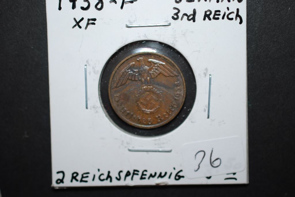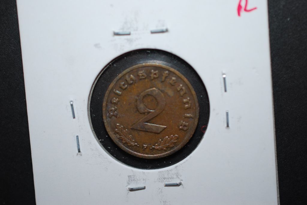 1938-F German 2 Reichspfennig Foreign Coin With Flying Eagle Holding Swatstika; XF; EST. $10-15