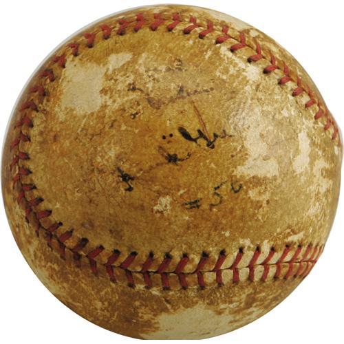 <B>1938 Hank Greenberg 56th Home Run Baseball.</B></I> "Class tells," Jackie Robinson was once quoted as saying. "It sticks out all over Mr. Greenberg." These two legendary figures are linked by far more than Hall of Fame credentials and a mutual admiration (Greenberg was among the only opposing players to welcome Robinson to the Majors in 1947), rating also as two of the bravest men to wear a professional athletic uniform. Before African-Americans became the prime target for racist fans, it was the Jews, and Greenberg in particular who drew the taunts and curses of fans and opponents alike. It has been rather convincingly argued that 1938 would have seen Greenberg break Babe Ruth's 1927 home run record, but seeing the danger that a Jew might assume this throne, opposing pitchers chose to walk the Tiger slugger rather than give him a shot at the Babe. And so Greenberg would finish the season with 119 free passes, the highest in the American League that season, and the greatest total of his career.<BR><BR> Here we present an incredible artifact from late in that memorable season that had every Jewish baseball fan in America huddled close to his radio, the very baseball launched by Greenberg to move with four long balls of Ruth, and within two of his own ultimate season total of fifty-eight. It comes to us from the great nephew of the man who caught the ball in the outfield bleachers of Detroit's Navin Field in the bottom of the seventh inning of a meeting with the Cleveland Indians on September 23, 1938. This consignor's included letter of provenance explains how his father, then a young boy, was handed the ball by his uncle and instructed to bring it to Greenberg for an autograph. The black ink inscription, "To Bob, Best Wishes, 'Hank' Greenberg," is still visible upon the ragged sphere's side panel.<BR><BR> Joining the inscription in the same ink but a different hand is the simple notation "#56," which has miraculously survived the rough treatment the ball received at the hands of our consignor, who admits that he removed the ball from his father's dresser drawer when he was a child and subjected it to a game in the street. Again, we stress that the numerical notation is undeniably vintage to the time of the autograph, and no other possible conclusion could be made as to its meaning, making our consignor's story iron-clad. So while the baseball has seen better days, no amount of "street ball" could wear away the tremendous historic significance of what is almost certainly the only documented Greenberg home run ball from that remarkable season, and possibly the only documented Greenberg home run ball, period. <I>LOA from PSA/DNA. LOA from James Spence Authentication.</B></I><BR><BR><b>Shipping:</b> Balls, Pucks, etc., Small (<a target="_blank" href="http://www.heritageauctions.com/common/shipping.php">view shipping information</a>)