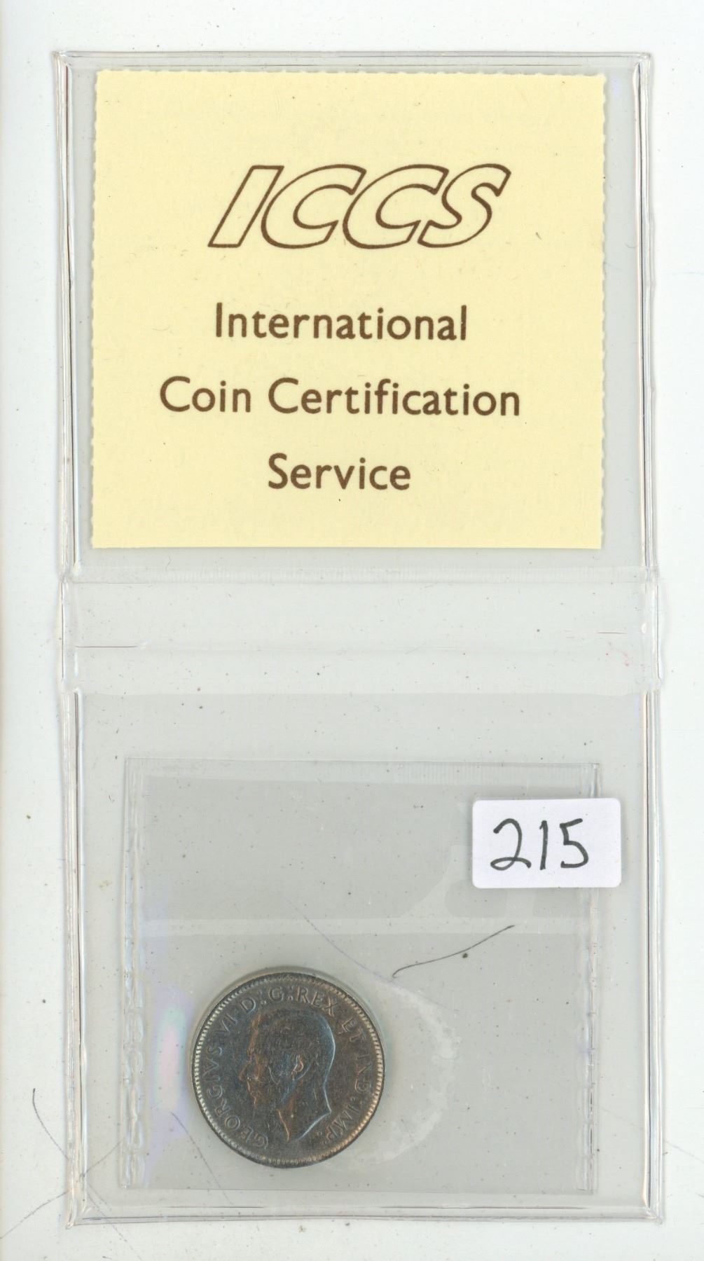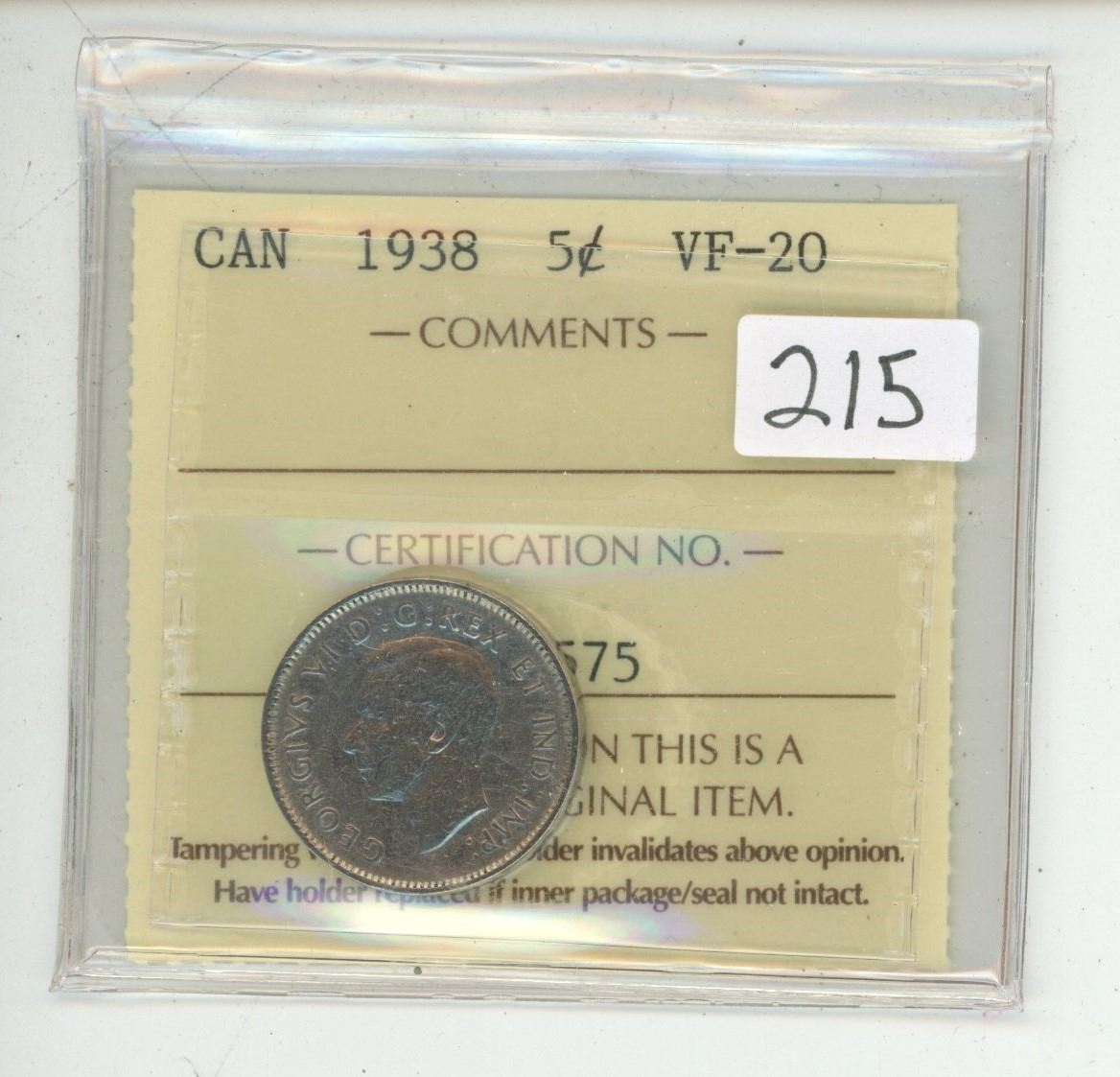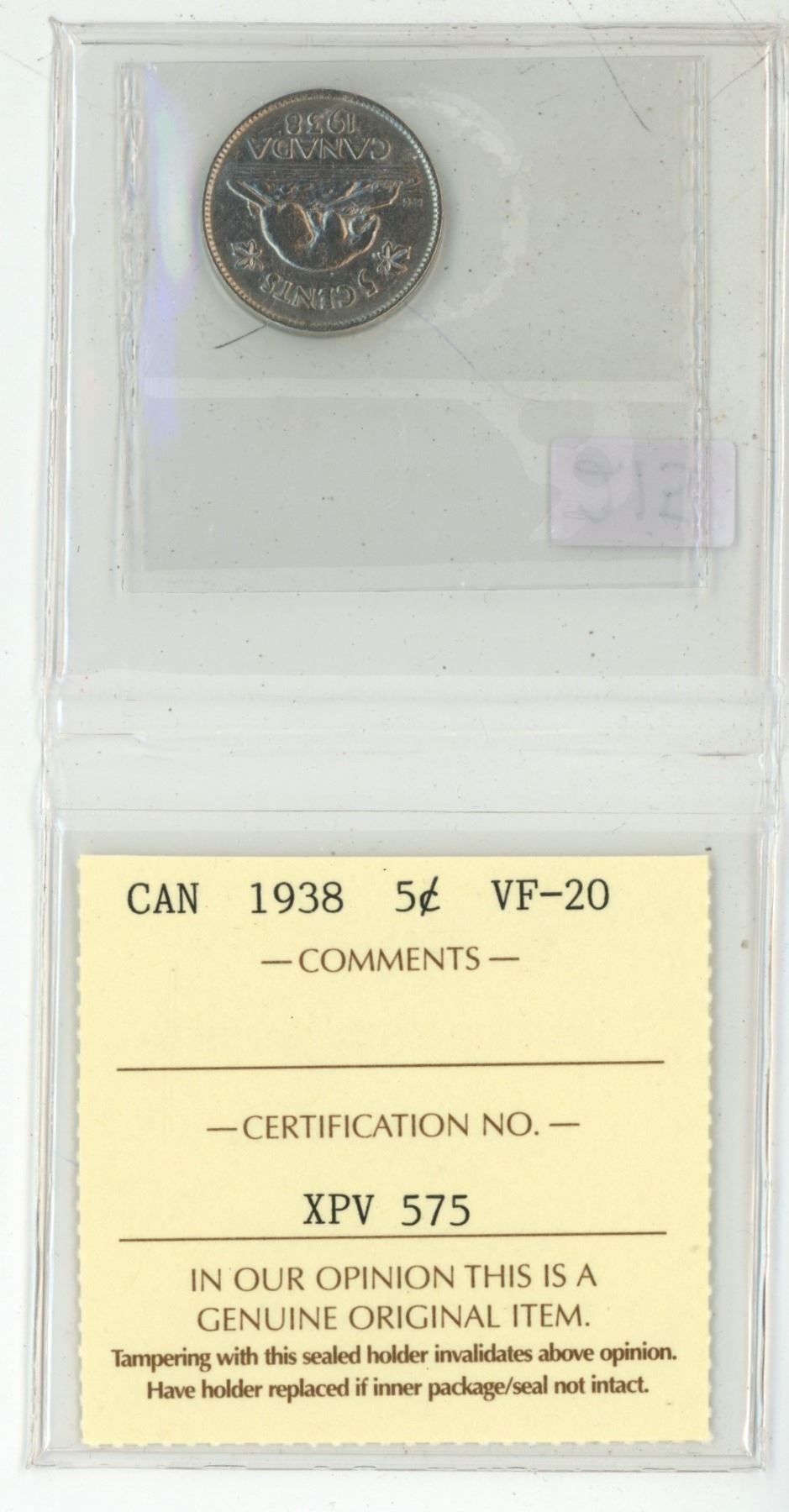 1938 ICCS graded, Canadian 5 cent coin - VF20