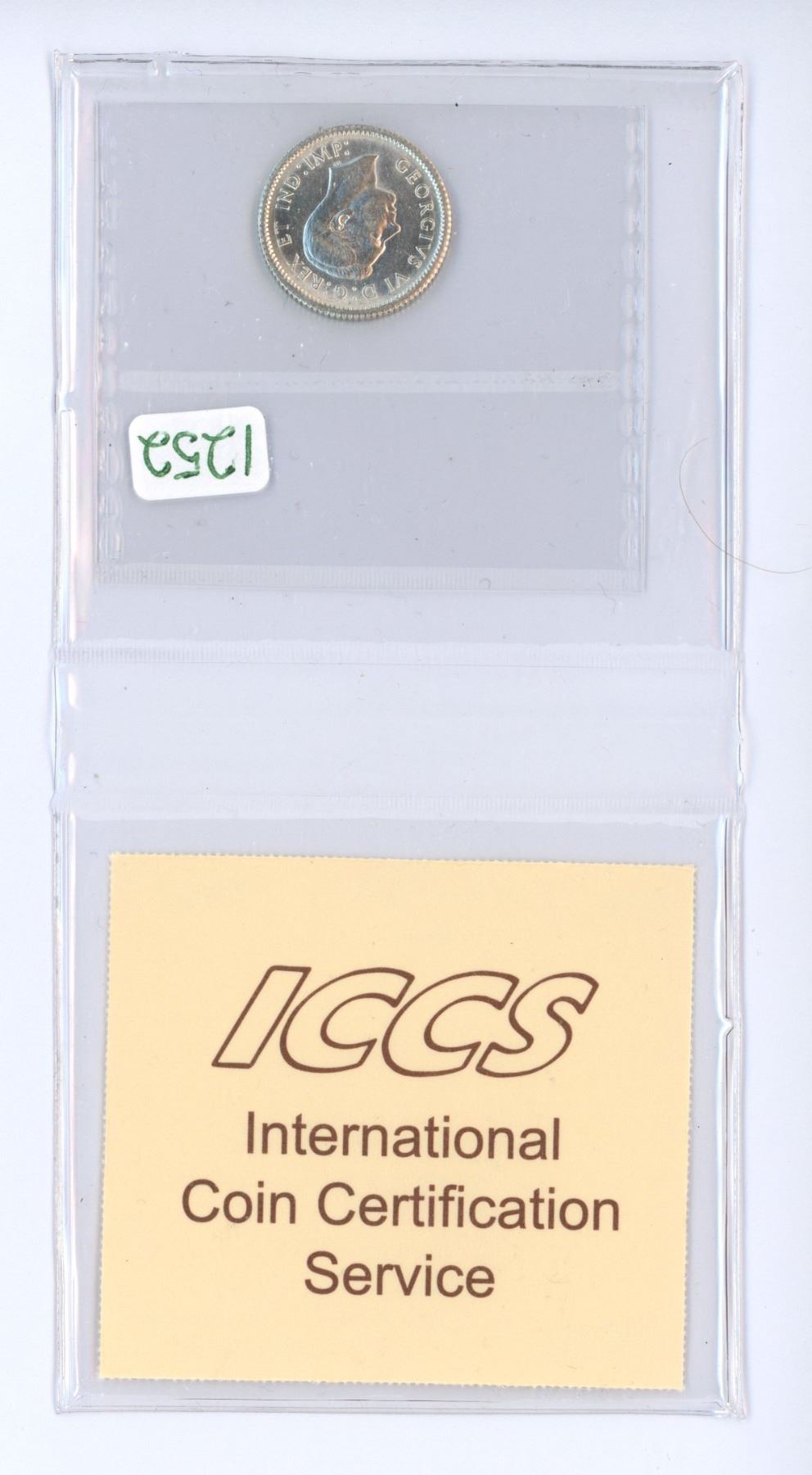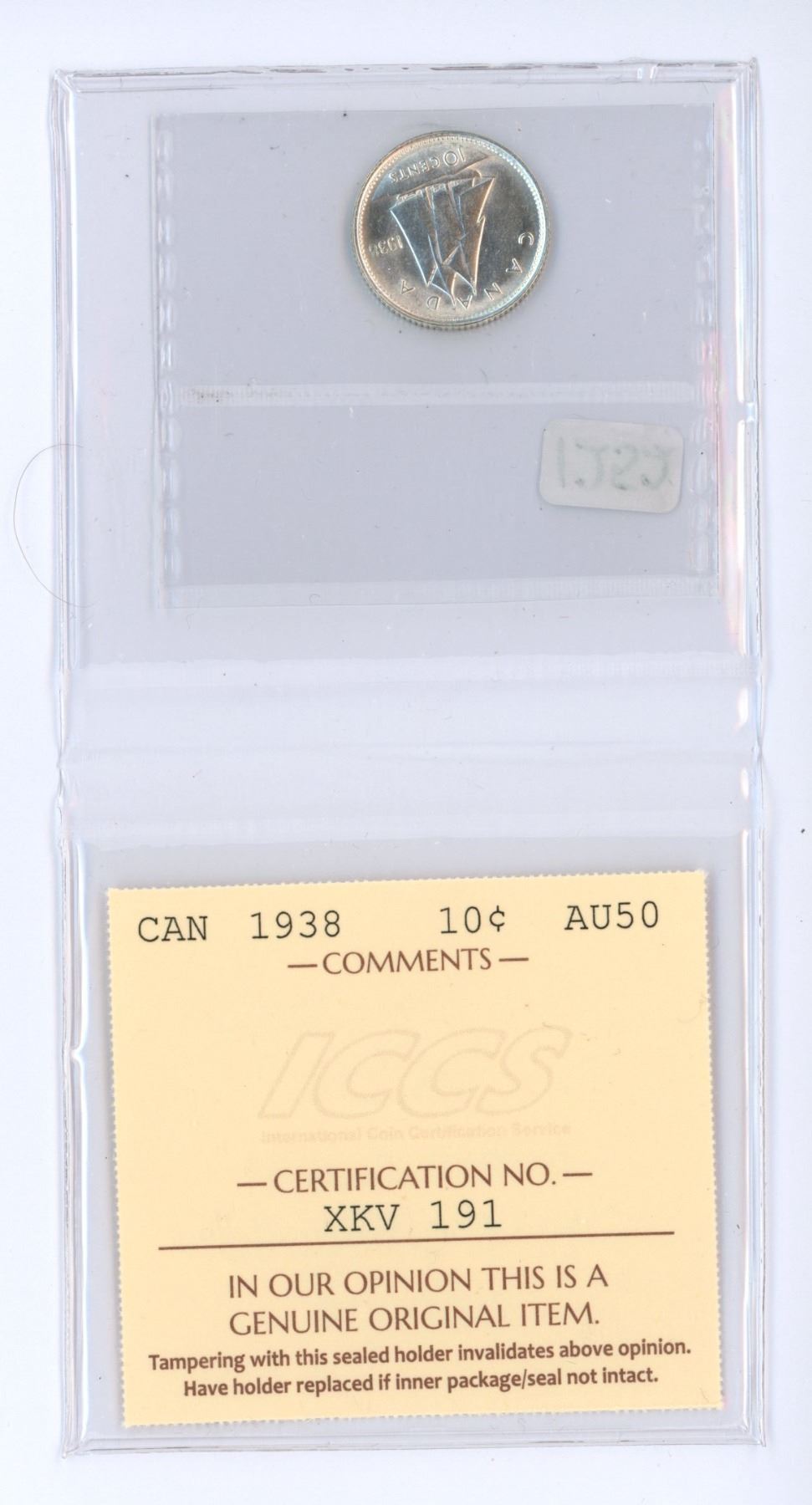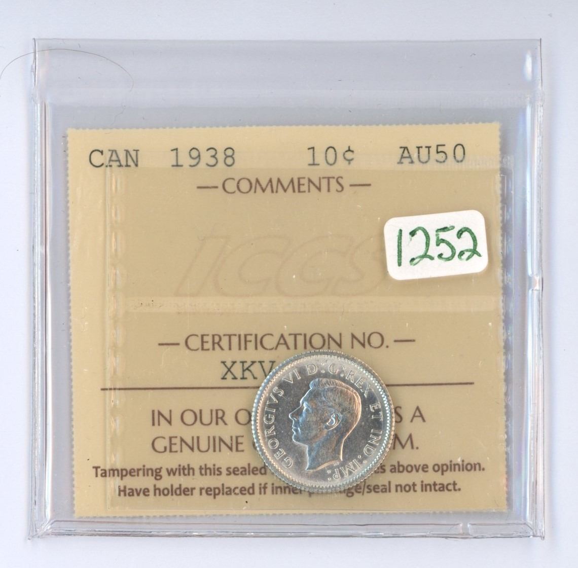 1938 ICCS graded, Canadian silver 10 cent coin - AU50